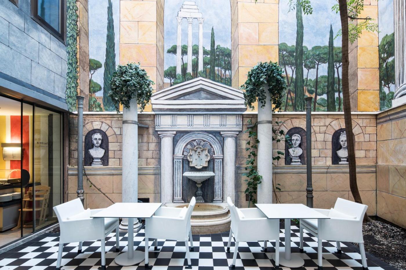 La recepción del Catalonia Roma está abierta las 24 horas y cuenta con un gran tragaluz de estilo vidriera. Hay servicio de alquiler de coches y servicio de cambio de divisa.